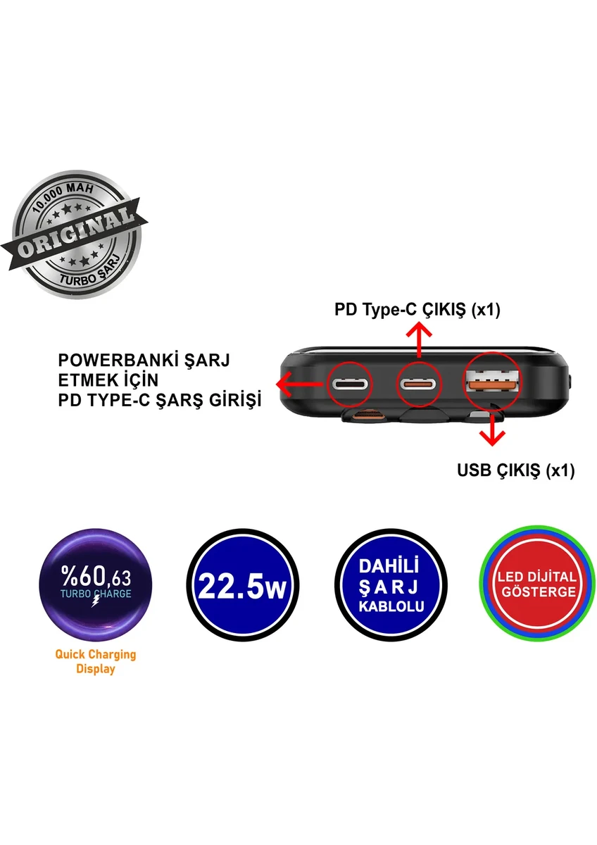 • Çift PD Type-C Çıkışı: PD Type-C çıkışları ile hızlı şarj yapabilme imkanı. Ayrıca PD Type-C giriş ile powerbankinizi hızlıca şarj edebilirsiniz.