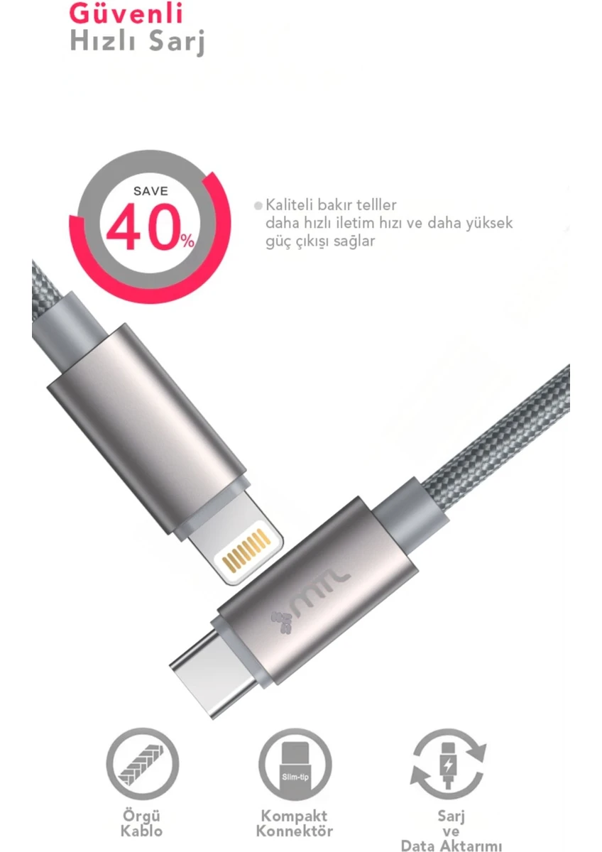 MTL Type-C to iPhone Lightning PD Hasır Hızlı Şarj Ve Data Aktarım Kablosu 30 Watt 1 Metre MT2120